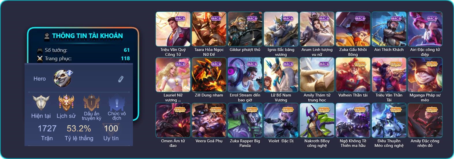 Arthur Siêu sao Cricket, Arthur Đặc cảnh băng lôi, Krixi Xứ Sở Thần Tiên, Krixi Tiệc Bãi Biển, Krixi Cô Tiên Thỏ, Krixi Phó văn nghệ, Krixi Thuỷ Thủ, TelAnnas Giám thị thân thiện, Telannas Dạ hội, Valhein Số 7 Thần Sầu, Valhein S-Quang Vinh, Butterfly Teen Nữ Công Nghệ, Violet Phi Công Trẻ, Violet Huy Chương Vàng, Natalya Quý Cô Thủy Tề, Triệu Vân Quý Công Tử, Zuka Đầu bếp hoàng cung, Zuka Rapper Big Panda, Veera Vũ hội bóng đêm, Veera Kimono, Veera Phù thủy Hội họa, Điêu Thuyền Nữ y tá, Điêu Thuyền Mèo công nghệ, Alice Bé Gấu Tuyết, Alice Xứ sở thần tiên, Alice Dạ hội, Alice The Butterfly Mansion Girl, Yorn Đặc Nhiệm Swat, Yorn Soái ca bãi biển, Rouie Sứ giả vũ trụ, Rouie Quang Vinh, Iggy Bạch hồ ly, Bonnie S Quang Vinh, Celica S-Quang Vinh, Liliana thần tượng âm nhạc, Sephera Phi vụ thế kỷ, Sephera Thủy Liên Hoa, Errol Stream đến bao giờ, Murad S-Quang Vinh, Lauriel Nữ vương học đường 2, Kahlii Kim cô giáo chủ, Kahlii Tử điệp, Hayate Bạch lang, Mganga Quái tặc không gian, Mganga Doombot Hủy Diệt, Capheny Hầu gái, Maloch Samurai Tử Sĩ, Maloch Đại ca Mukbang, Taara Hỏa Ngọc Nữ Đế, Ishar Giấc Mơ Ngọt Ngào, Arum Thú Vệ Cổ Mộ, Airi Cấm Vệ Nguyệt Tộc, Raz Siêu việt, Ilumia Ngược dòng thời gian, Omega Cỗ Máy Siêu Tốc, Omega Hộ Vệ Carano, Richter Quang vinh 2.0, Keera Nghệ sĩ Graffiti, Bright Kỳ Lân Soái, Ignis Bắc băng vương, Yena Nữ hoàng thể thao, Omen Sĩ Quan Viễn Chinh, Annette Xứ sở thần tiên, Tachi Đao khách vô tình, Slimz Siêu Cấp Tối Thượng, Sinestrea S-Quang vinh, Marja Linh Xà Tư Tế, Volkath Quang vinh, Zill Quái xế, Thorne Thám tử trung họ