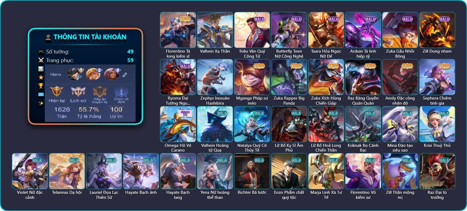 Valhein Hoàng tử Quạ, Valhein Số 7 Thần Sầu, Valhein Thần tài, Valhein S-Quang Vinh, Valhein Đệ nhất thần thám, Triệu Vân Quý Công Tử, Triệu Vân Thần Tài, Krixi Cô Tiên Thỏ, Krixi Thuỷ Thủ, Mina Tiệc Bánh Kẹo, Mina Đào tạo siêu sao, Mganga Doombot Hủy Diệt, Grakk Thuyền Trưởng Râu Đỏ, Grakk Mèo thần tài, Grakk Thần ẩm thực, Butterfly Xuân nữ ngổ ngáo, Butterfly Bình Minh Tận Thế, Maloch Ác Ma Địa Ngục, Maloch Đại ca Mukbang, Veera Goá Phụ, Veera Phù thủy Hội họa, Điêu Thuyền Nữ Vương Anh Đào, Điêu Thuyền Mèo công nghệ, Annette Xứ sở thần tiên, Taara Hỏa Ngọc Nữ Đế, Toro Ngưu hải vương, Yorn Soái ca bãi biển, Fennik Nhà thám hiểm, Fennik Tiệc Bánh Kẹo, Max Trà Chanh, TelAnnas Cảnh Vệ Rừng, TelAnnas Giám thị thân thiện, Telannas Dạ hội, Tel Annas Jujutsu Sorcerer, Kahlii Kim cô giáo chủ, Kahlii Rối Nước Thuỷ Đình, Ishar Capoo Boom, Kriknak Bọ Cánh Bạc, Dirak Ông bầu Showbiz, Dirak Đường chủ yêu giới, Allain Lân sư Vũ thần, Zephys Đầu bếp Sashimi, Murad M-TP Thần Tượng Học Đường, Murad S-Quang Vinh, Amily Hội ám hoàng, Amily Nữ đội trưởng, Amily Thám tử trung học, Stuart Vua hề, Baldum, Baldum Đồ chơi, Aleister Quỷ soái nguyệt tộc, Sephera Chiêm tinh gia, Sephera Thủy Liên Hoa, Ngộ Không Thần Giáp Xích Diễm, Kaine Thợ Săn Chính Nghĩa, Bright Kỳ Lân Soái, Tachi Đao khách vô tình, Lauriel Lạc thần, Lauriel Nữ vương học đường 2, Elandorr Học viện Carano, Paine khúc nhạc tử vong, Quillen Sao đỏ học đường, Quillen Huyết phong, Rouie Sứ giả vũ trụ, Rouie Quang Vinh, Slimz Chú thỏ ngọc, Slimz Lẩu chua cay, Slimz Sứ giả Thiên giới, Slimz Siêu Cấp Tối Thượng, Liliana thần tượng âm nhạc, Liliana Thuỷ thủ hồ ly, Enzo Phẩm chất quý tộc, Omega Người máy xanh, Omega Hộ Vệ Carano, Capheny Kimono, Capheny S-Quang Vinh, Lumburr, Lumburr Cự thần viễn cổ, Raz Saitama Cosplay, Laville Tiệc bãi biển, Zuka Đại Phú Ông, Zuka Đầu bếp hoàng cung, Zuka Rapper Big Panda, Zuka Xích Hùng Chiến Giáp, Celica S-Quang Vinh, Errol Stream đến bao giờ, Elsu Mafia, Astrid Hoa anh đào, Alice Bé Gấu Tuyết, Alice Dạ hội, Alice The Butterfly Mansion Girl, Ilumia Nữ Chúa Tuyết, Ilumia Diva nổi loạn, Keera Học viên Carano, Keera Nghệ sĩ Graffiti, Richter Thống soái kháng chiến, Richter Quang vinh 2.0, Hayate Bạch lang, Veres Đạo tặc, Veres Chị đại học đường, Thorne Ước nguyện giáng sinh, Thorne Thám tử trung học, Thane Khoảnh khắc vinh quang, Teemee Thịt xiên nướng, Teemee Giấc Mơ Ngọt Ngào, Krizzix Crursed Corpse, Violet Đặc Dị, Airi Kiemono, Airi Đặc công tử điệp, Azzenka Quang Vinh 2.0, AzzenKa Giáng sinh An lành, Roxie Hỏa thuật sư, Aya Điệp viên ký ức, Ybneth Hạt trưởng kiểm lâm, Ybneth Candy Bear, Volkath Xung thiên thần tướng, Volkath Quang vinh, Sinestrea Lữ khách sa mạc, Sinestrea S-Quang vinh, Arthur Hoàng kim cốt, Tulen Dạ hội, Zip Gà siêu quậy, Zip Ông trùm giáng sinh, Florentino S-Quang Vinh, Zill Thần mộng mị, Nakroth BBoy công nghệ, Lữ Bố Vũ điệu Samba, Omen Thuyền trưởng hải tặc, Dolia Môn đồ tập sự, Yena Thỏ may mắn, Bonnie S Quang Vinh, Caesar Bão tố, Qi Đặc vụ cáo tuyết, Arduin Nhà vô địch, Ignis Vì sao con khóc