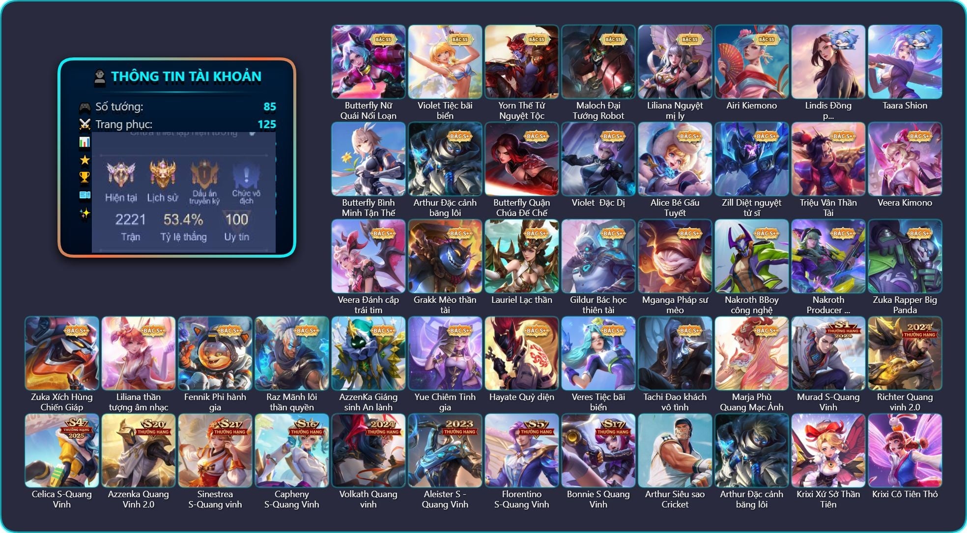 Valhein Hoàng tử Quạ, Valhein Số 7 Thần Sầu, Valhein Khiêu chiến, Valhein Xạ Thần, Valhein S-Quang Vinh, Triệu Vân Thần Tài, Krixi Thuỷ Thủ, Veera Goá Phụ, Veera Phù thủy Hội họa, Mina Lưỡi hái hoàng kim, Mina Đào tạo siêu sao, Toro Bạch mao Ngưu, Toro Ngưu hải vương, Gildur phượt thủ, Yorn Cung thủ bóng đêm, Lindis Thám Tử Tư, Lindis Quang Vinh, Alice Xứ sở thần tiên, Mganga Doombot Hủy Diệt, Taara Hỏa Ngọc Nữ Đế, Arduin, Arduin Quang Vinh, Natalya Quý Cô Thủy Tề, Slimz Thỏ Thợ Mỏ, Slimz Siêu Cấp Tối Thượng, Kriknak Bọ Cánh Bạc, Zephys Phi thương, Zephys Tư lệnh viễn chinh, Zephys Inosuke Hashibira, Krizzix Crursed Corpse, Amily Đặc cảnh NYPD, Amily Hội ám hoàng, Enzo Phẩm chất quý tộc, Enzo Thần thoại Hy Lạp, Enzo Nhà Leo núi, Elandorr Soái tặc, Elandorr Phi vụ thế kỷ, TelAnnas Cảnh Vệ Rừng, TelAnnas Giám thị thân thiện, Telannas Dạ hội, TelAnnas Quang Vinh, Tel Annas Jujutsu Sorcerer, Violet Nữ đặc cảnh, Max Quang Vinh, Max Thần thoại Hy Lạp, Zill Dung nham, Celica S-Quang Vinh, Yena Nữ hoàng thể thao, Yena Dạ nguyệt thánh nữ, Annette Xứ sở thần tiên, Arthur Lãnh chúa xương, Arthur Siêu sao Cricket, Richter Dạ hội, Fennik Nhà thám hiểm, Fennik Tay đua F1, Teemee Tay đua siêu tốc, Wisp Hải Tặc Nhí, Wisp Ếch nhồi bông, Capheny Hầu gái, Capheny S-Quang Vinh, Ryoma Đại Tướng Nguyệt Tộc, Ryoma Ailing Samurai, Hayate Bạch ảnh, Hayate Bạch lang, Preyta Phi cơ F1, Maloch Tiệc hóa trang, Maloch Ác nhân vô tuyến, Laville Tay súng vô địch, Laville Kim quy thần vương, Thorne Thám tử trung học, Dirak Cảnh Vệ Bầu Trời, Dirak Quý tộc, Dirak Đường chủ yêu giới, Lữ Bố Nam Vương, Paine khúc nhạc tử vong, Moren Anh thợ điện, Volkath Ma kỵ tử sĩ, Volkath Tư lệnh viễn chinh, Volkath Quang vinh, Zata Tư lệnh viễn chinh, Lorion Chiến giáp hắc ám, Florentino SEVEN, Florentino S-Quang Vinh, Airi Ninja Xanh Lá, Airi Kiemono, Airi Đặc công tử điệp, Airi Lễ hội mùa xuân, Điêu Thuyền Mèo công nghệ, Tulen Phù Thủy Kiến Tạo, Marja Linh Xà Tư Tế, Murad Thiên Tài Sân Cỏ, Murad S-Quang Vinh, Raz Đại tù trưởng, Arum Linh tượng vu nữ, Arum Nữ hoàng gấu xám, Thane Kẻ Hủy Diệt, Thane Mật vụ, Grakk Mèo thần tài, Grakk Sumo, Grakk Thần ẩm thực, Ata Quang vinh, Errol Stream đến bao giờ, Veres Chị đại học đường, Nakroth Quân đoàn địa ngục, Nakroth BBoy công nghệ, Zuka Gấu Nhồi Bông, Zuka Đầu bếp hoàng cung, Zuka Mãnh hổ, Butterfly Bình Minh Tận Thế, Sephera Chiêm tinh gia, Sephera Thủy Liên Hoa, Ybneth Candy Bear, Omega Người máy xanh, Omega Hộ Vệ Carano, Qi Thiếu nữ pháo hoa, Qi Blogger Ẩm thực, Dextra Quý cô Tuổi Dần, Omen Ám tử đao, Omen Thuyền trưởng hải tặc, Roxie Hỏa thuật sư, Ngộ Không Đạo tặc, Ngộ Không Ngộ Khá Trẩu, Ngộ Không Cổ thần Ai Cập, Lauriel Đọa Lạc Thiên Sứ, Kaine Thợ Săn Chính Nghĩa, Liliana thần tượng âm nhạc, Liliana Thuỷ thủ hồ ly, Tachi Đao khách vô tình, Azzenka Quang Vinh 2.0, Sinestrea S-Quang vinh, Bonnie S Quang Vinh