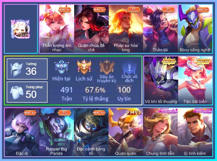 Arthur Si Tình Kiếm, Arthur Đặc cảnh băng lôi, Krixi Tiệc Bãi Biển, Krixi Phó văn nghệ, TelAnnas Giám thị thân thiện, TelAnnas Chung Tình Tiễn, Telannas Dạ hội, TelAnnas Quang Vinh, Valhein Vũ khí tối thượng, Valhein S-Quang Vinh, Butterfly Quận Chúa Đế Chế, Violet Phi Công Trẻ, Violet Đặc Dị, Nakroth BBoy công nghệ, Nakroth Quán quân, Triệu Vân Quý Công Tử, Triệu Vân Thần Tài, Maloch Samurai Tử Sĩ, Stuart Vua hề, Darcy Pháp sư hỏa long, Grakk Thuyền Trưởng Râu Đỏ, Kahlii Tử điệp, Ngộ Không Đạo tặc, Ngộ Không Cổ thần Ai Cập, Alice The Butterfly Mansion Girl, Zuka Rapper Big Panda, Qi Blogger Ẩm thực, Taara Hỏa Ngọc Nữ Đế, Yena Nữ cướp biển, Rouie Quang Vinh, Zill Thần mộng mị, Max Chuyên gia đập hộp, Yan nhà chế tác, Arum Thú Vệ Cổ Mộ, Xeniel Thiên Sứ Hủy Diệt, Airi Đặc công tử điệp, Liliana thần tượng âm nhạc, Liliana Thuỷ thủ hồ ly, Amily Nữ đội trưởng, Kaine Người dơi, Mina Đào tạo siêu sao, Ilumia Nữ Chúa Tuyết, Sephera Thủy Liên Hoa, Roxie Hầu gái, Keera Học viên Carano, Errol Stream đến bao giờ, Fennik Nhà thám hiểm, Murad S-Quang Vinh, Lauriel Nữ vương học đường 2, Veres Đạo tặc