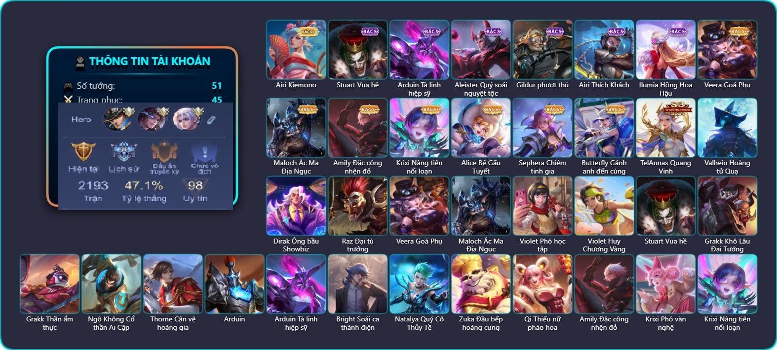Arthur Lãnh chúa xương, Arthur Siêu sao Cricket, Arthur Đặc cảnh băng lôi, Krixi Phó văn nghệ, Krixi Quán quân, TelAnnas Giám thị thân thiện, Telannas Thánh nữ mật hội, Valhein Khiêu chiến, Valhein Đệ nhất thần thám, Butterfly Xuân nữ ngổ ngáo, Butterfly Quận Chúa Đế Chế, Butterfly Gánh anh đến cùng, Butterfly Kim ngư thần nữ, Butterfly Bình Minh Tận Thế, Violet Phó học tập, Violet Đặc Dị, Violet Huy Chương Vàng, Alice Xứ sở thần tiên, Dirak Pháp sư trăng khuyết, Allain Lân sư Vũ thần, Veera Bách hoa tiên nữ, Stuart Vua hề, Kahlii Kim cô giáo chủ, Kahlii Rối Nước Thuỷ Đình, Mganga Doombot Hủy Diệt, Zephys Tư lệnh viễn chinh, Tachi Xích long hỏa diệm, Tachi Đao khách vô tình, Airi Đặc công tử điệp, Zill Thần mộng mị, Nakroth Producer Tia chớp, Toro Đặc cảnh NYPD, Enzo Chiến binh trăng khuyết, Enzo Thần thoại Hy Lạp, Enzo Nhà Leo núi, Fennik Phi hành gia, Laville Thám tử học đường, Zuka Gấu Nhồi Bông, Zuka Xích Hùng Chiến Giáp, Florentino Vũ kiếm sư, Florentino S-Quang Vinh, Bijan Giai Điệu Giáng Sinh, Sinestrea Giấc mơ trưa, Sinestrea WaVe, Sinestrea Đại tiểu thư 1, Sinestrea Lữ khách sa mạc, Sinestrea S-Quang vinh, Liliana Thuỷ thủ hồ ly, Zata Tư lệnh viễn chinh, Yan nhà chế tác, Zip Cá siêu quậy, Hayate Bạch ảnh, Hayate Bạch lang, Hayate Bóng người dưới trăng, AzzenKa Giáng sinh An lành, Dolia Môn đồ tập sự, Iggy Bạch hồ ly, Volkath Quang vinh, Murad Điệp viên Anubis, Elsu Mafia, Elsu Xạ Thần Mộng Giới, Max Hiệp Sĩ Nhí, Max Chuyên gia đập hộp, Max Trà Chanh, Capheny Hầu gái, KilGroth Cảnh Vệ Biển, KilGroth Càn Nguyên Thủ Vệ, Roxie Hầu gái, Yena Hoa tiêu Mộng giới, Astrid Hoa anh đào, Yue Vũ phiến hỏa diệm, Raz Đại tù trưởng, Teemee Giấc Mơ Ngọt Ngào, Thane Khoảnh khắc vinh quang, Bonnie S Quang Vinh, Xeniel Thiên Sứ Hủy Diệt, Aleister S - Quang Vinh, Dextra Chiến binh quyến rũ, Bright Nhà thám hiểm, Keera Quán Quân, Taara Shion, Teeri Minh Tinh Ảo Thuật, Paine khúc nhạc tử vong