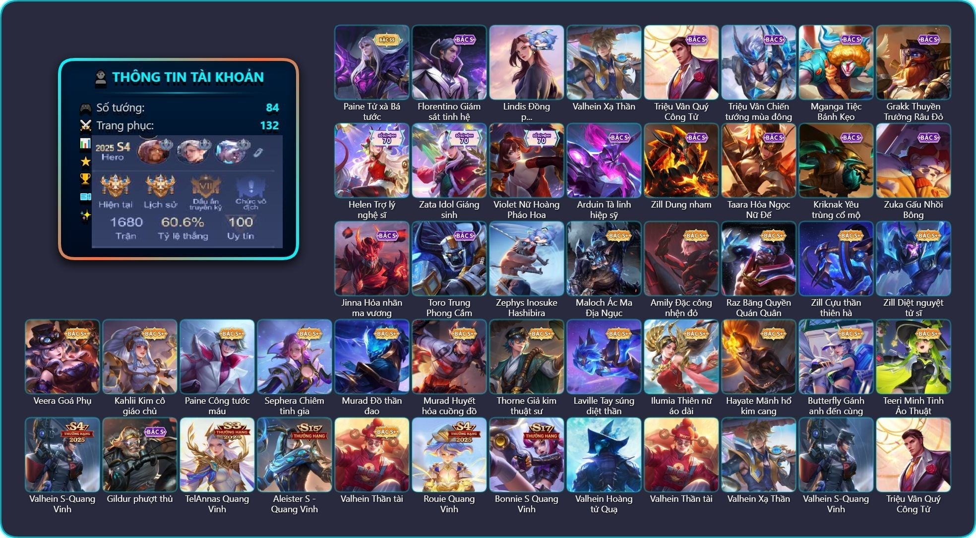 Valhein Hoàng tử Quạ, Valhein Thần tài, Valhein Xạ Thần, Valhein S-Quang Vinh, Triệu Vân Quý Công Tử, Triệu Vân Chiến tướng mùa đông, Krixi Phó văn nghệ, Krixi Thuỷ Thủ, Zephys Tư lệnh viễn chinh, Zephys Inosuke Hashibira, TelAnnas Cảnh Vệ Rừng, Telannas Thánh nữ mật hội, Telannas Dạ hội, TelAnnas Quang Vinh, Mganga Tiệc Bánh Kẹo, Mganga Doombot Hủy Diệt, Grakk Thuyền Trưởng Râu Đỏ, Grakk Màu cờ sắc áo, Butterfly Gánh anh đến cùng, Maloch Ác Ma Địa Ngục, Maloch Ác nhân vô tuyến, Wisp Hải Tặc Nhí, Toro Đặc cảnh NYPD, Toro Trung Phong Cắm, Toro Bạch mao Ngưu, Gildur phượt thủ, Annette Xứ sở thần tiên, Preyta Không Tặc, Mina Đào tạo siêu sao, Teemee Thịt xiên nướng, Amily Đặc cảnh NYPD, Amily Đặc công nhện đỏ, Amily Hội ám hoàng, Florentino Vũ kiếm sư, Florentino Giám sát tinh hệ, Florentino Kiếm sĩ Olympic, Florentino Thần thoại Hy Lạp, Skud Sơn Tặc, Lumburr Dung Nham, Arduin, Arduin Tà linh hiệp sỹ, Raz Đại tù trưởng, Raz Băng Quyền Quán Quân, Kaine Đôi Cánh Đại Dương, Kaine Người dơi, Kaine Thợ Săn Chính Nghĩa, Lindis Dạ tiệc, Lindis Đồng phục Shihakusho, Zill Dung nham, Zill Cựu thần thiên hà, Zill Diệt nguyệt tử sĩ, Zill Thần mộng mị, Taara Hỏa Ngọc Nữ Đế, Veera Goá Phụ, Veera Thiên nga đen, Ryoma Thợ Săn Tiền Thưởng, Ryoma Dạ hội, Arum Nữ hoàng gấu xám, Capheny Hầu gái, Bright Soái ca thánh điện, Kriknak Yêu trùng cổ mộ, Zata Tư lệnh viễn chinh, Zata Idol Giáng sinh, Kahlii Kim cô giáo chủ, Kahlii Siêu đầu bếp, Zuka Phát Tài, Zuka Gấu Nhồi Bông, Zuka Đầu bếp hoàng cung, Slimz Sứ giả Thiên giới, Jinna Đại Tư Tế, Jinna Hỏa nhãn ma vương, Điêu Thuyền Nữ y tá, Paine Công tước máu, Paine Tử xà Bá tước, Qi Thiếu nữ pháo hoa, Qi Blogger Ẩm thực, Enzo Phẩm chất quý tộc, Enzo Nhà Leo núi, Liliana Thuỷ thủ hồ ly, Arthur Hoàng kim cốt, Arthur Siêu sao Cricket, Tulen Nhà Thám Hiểm, Tulen Phù Thủy Kiến Tạo, Dextra Quý cô Tuổi Dần, Helen Trợ lý nghệ sĩ, Thane Kẻ Hủy Diệt, Thane Khoảnh khắc vinh quang, Elsu Xạ Thần Mộng Giới, Airi Ninja Xanh Lá, Elandorr Soái tặc, Elandorr Phi vụ thế kỷ, Elandorr Học viện Carano, Zip Gà siêu quậy, Zip Cá siêu quậy, Lữ Bố Kỵ Sĩ Âm Phủ, Sephera Chiêm tinh gia, Yena Khuyên Bạc, Yena Hoạt náo viên, Yena Nữ cướp biển, Yena Hoa tiêu Mộng giới, Murad Thợ Săn Tiền Thưởng, Murad Đồ thần đao, Murad Huyết hỏa cuồng đồ, Roxie Lễ hội hoa, Ata Mèo đi mưa, Aleister Thiếu Niên Hắc Ám, Aleister S - Quang Vinh, Fennik Shipper Siêu thanh, Ybneth Hạt trưởng kiểm lâm, Rourke Cuồng tặc, Lauriel Đọa Lạc Thiên Sứ, Omega Hộ vệ ba bích, Violet Nữ Hoàng Pháo Hoa, Violet Nữ đặc cảnh, Violet Phó học tập, Rouie Quang Vinh, Caesar Bão tố, Ngộ Không Cổ thần Ai Cập, Azzenka U Hồn Sa Mạc, Lorion Chiến giáp hắc ám, Ignis Hỏa Thuật Sư, Omen Sĩ Quan Viễn Chinh, Xeniel Kim sí điểu, Thorne Giả kim thuật sư, Bonnie S Quang Vinh, Laville Tay đua đường phố, Laville Tay súng diệt thần, KilGroth Cảnh Vệ Biển, Ilumia Thiên nữ áo dài, Hayate Mãnh hổ kim cang, Teeri Minh Tinh Ảo Thuật, Volkath Dạ Huyết Tộc