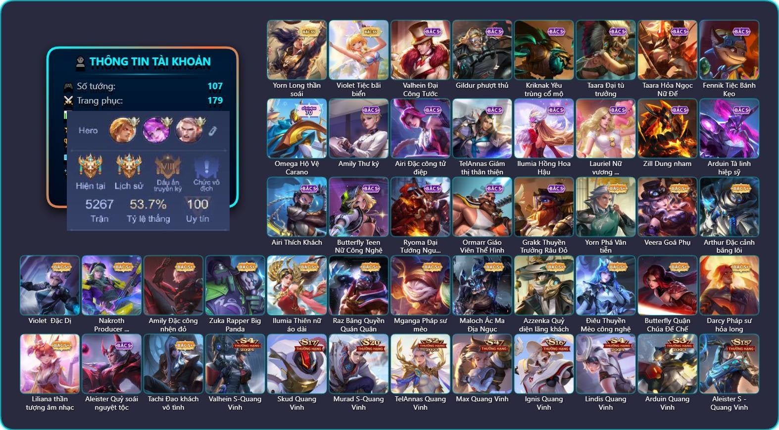 Valhein Hoàng tử Quạ, Valhein Đại Công Tước, Valhein Số 7 Thần Sầu, Valhein S-Quang Vinh, Krixi Công chúa Bướm, Krixi Phó văn nghệ, Gildur phượt thủ, Gildur Đại gia học viện, Gildur Đại võ sư, Yorn Cung thủ bóng đêm, Yorn Phá Vân tiễn, Yorn Long thần soái, Yorn Soái ca bãi biển, Toro Bạch mao Ngưu, Toro Ngưu hải vương, Mina Tiểu thư đoạt hồn, Mina Tiệc Bánh Kẹo, Veera Goá Phụ, Kriknak Bọ Cánh Bạc, Kriknak Yêu trùng cổ mộ, Natalya Quý Cô Thủy Tề, Arthur Hoàng kim cốt, Arthur Siêu sao Cricket, Arthur Đặc cảnh băng lôi, Taara Đại tù trưởng, Taara Hỏa Ngọc Nữ Đế, Skud Quang Vinh, Skud Mafia, Violet Nữ đặc cảnh, Violet Tiệc bãi biển, Violet Phó học tập, Violet Đặc Dị, Violet Tay Súng Siêu Phẩm, Violet Huy Chương Vàng, Nakroth Producer Tia chớp, Lữ Bố Hoả Long Chiến Thần, Annette Nữ quản ga, Annette Xứ sở thần tiên, Annette Vân mộng tiên tử, Fennik Nhà thám hiểm, Fennik Đội đặc nhiệm, Fennik Tiệc Bánh Kẹo, Astrid Bạch Kiếm Tiểu Thư, Amily Đặc công nhện đỏ, Amily Thư ký, Amily Hội ám hoàng, Airi Thích Khách, Airi Ninja Xanh Lá, Airi Đặc công tử điệp, Arum Thần tượng nhạc Rock, Marja Linh Xà Tư Tế, Murad Thợ Săn Tiền Thưởng, Murad S-Quang Vinh, TelAnnas Cảnh Vệ Rừng, TelAnnas Giám thị thân thiện, Telannas Thánh nữ mật hội, Telannas Dạ hội, TelAnnas Quang Vinh, Moren Anh thợ điện, Zuka Đầu bếp hoàng cung, Zuka Rapper Big Panda, Ilumia Nữ Chúa Tuyết, Ilumia Hồng Hoa Hậu, Ilumia Thiên nữ áo dài, Ilumia Ngược dòng thời gian, Omen Sĩ Quan Viễn Chinh, Omen Thuyền trưởng hải tặc, Raz Đại tù trưởng, Raz Băng Quyền Quán Quân, Lauriel Nữ vương học đường 2, Max Hiệp Sĩ Nhí, Max Quang Vinh, Zill Lốc Địa Ngục, Zill Dung nham, Zill Thần mộng mị, Cresht Thợ sửa cáp, Caesar Bão tố, Mganga Hề cung đình, Mganga Pháp sư mèo, Slimz Thỏ Thợ Mỏ, Slimz Siêu Cấp Tối Thượng, Ngộ Không Đạo tặc, Ngộ Không Cổ thần Ai Cập, Tulen Nhà Thám Hiểm, Tulen Phù Thủy Kiến Tạo, Tulen Dạ hội, Lumburr Dung Nham, Ignis Quang Vinh, Lindis Thám Tử Tư, Lindis Quang Vinh, Teemee Tay đua siêu tốc, Arduin, Arduin Quang Vinh, Arduin Tà linh hiệp sỹ, Xeniel Thiên Sứ Hủy Diệt, Xeniel Shipper bánh mỳ, Aleister Thiếu Niên Hắc Ám, Aleister Quỷ soái nguyệt tộc, Aleister S - Quang Vinh, Wisp Hải Tặc Nhí, Stuart Trò đùa tử vong, Stuart Gã hề, Preyta Không Tặc, Preyta Phi cơ F1, Maloch Ác Ma Địa Ngục, Maloch Ác nhân vô tuyến, Maloch Đại ca Mukbang, Rourke Pháo Thủ Tuộc Neo, Enzo Phẩm chất quý tộc, Azzenka Quỷ diện lãng khách, Azzenka Quang Vinh 2.0, Azzenka U Hồn Sa Mạc, Điêu Thuyền Nữ Vương Anh Đào, Điêu Thuyền Mèo công nghệ, Alice Xứ sở thần tiên, Alice Dạ hội, Richter Dạ hội, Richter Quang vinh 2.0, Richter Cứu hộ, Zip Gà siêu quậy, Ishar Giấc Mơ Ngọt Ngào, Dirak Quý tộc, Dirak Ông bầu Showbiz, Dirak Đường chủ yêu giới, Keera Y tá lạ, Keera Thuỷ thủ, Keera Nghệ sĩ Graffiti, Butterfly Thủy thủ, Butterfly Teen Nữ Công Nghệ, Butterfly Quận Chúa Đế Chế, Wonder Woman Thế Chiến, Elsu Mafia, Darcy Nam tước, Darcy Pháp sư hỏa long, Hayate Bạch ảnh, Hayate Bạch lang, Ryoma Đại Tướng Nguyệt Tộc, Ryoma Dạ hội, Elandorr Phi vụ thế kỷ, Elandorr Học viện Carano, Zephys Phi thương, Zephys Tư lệnh viễn chinh, Volkath Quang vinh, Laville Tay súng vô địch, Capheny S-Quang Vinh, Yena Hoạt náo viên, Liliana Hồ Quý Phi, Liliana thần tượng âm nhạc, Liliana Thuỷ thủ hồ ly, Allain Lân sư Vũ thần, Thane Kẻ Hủy Diệt, Qi Thiếu nữ pháo hoa, Sephera Phi vụ thế kỷ, Errol Vượt ngục, Bright Soái ca thánh điện, Bright Kỳ Lân Soái, Roxie Thám tử tập sự, Roxie Lễ hội hoa, Roxie Hỏa thuật sư, Ata Quang vinh, Omega Người máy xanh, Omega Cỗ Máy Siêu Tốc, Omega Hộ Vệ Carano, Celica S-Quang Vinh, Paine khúc nhạc tử vong, Ormarr Giáo Viên Thể Hình, KilGroth Cảnh Vệ Biển, Sinestrea S-Quang vinh, Grakk Thuyền Trưởng Râu Đỏ, Grakk Màu cờ sắc áo, Grakk Thần ẩm thực, Ybneth Hạt trưởng kiểm lâm, Quillen Trưởng ngoại khoa, Florentino Thần thoại Hy Lạp, Aya Điệp viên ký ức, Aya Thủy thủ, Tachi Đao khách vô tình, Dextra Lữ khách cao nguyên, Dolia Môn đồ tập sự