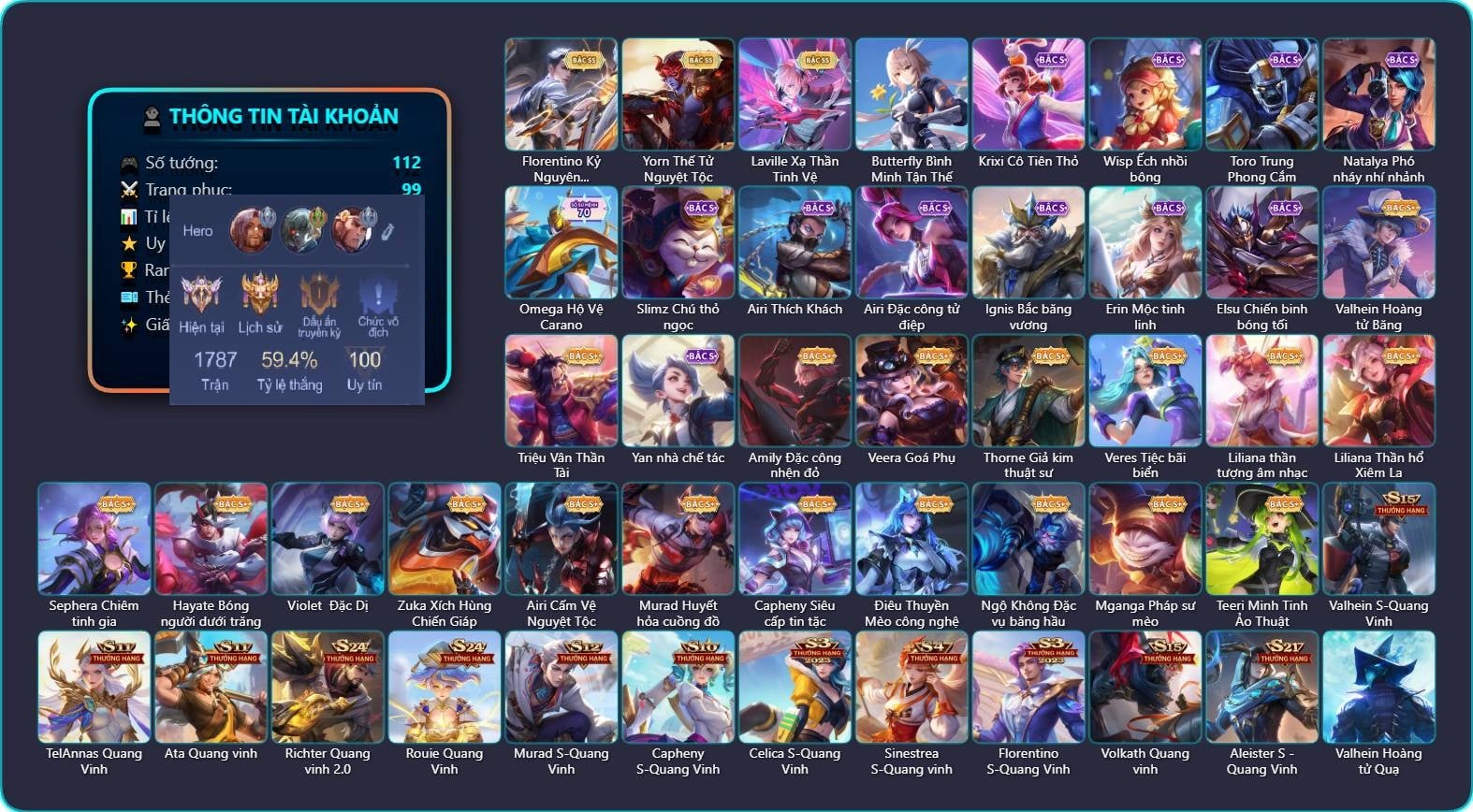 Valhein Hoàng tử Quạ, Valhein Hoàng tử Băng, Valhein S-Quang Vinh, Triệu Vân Thần Tài, Krixi Cô Tiên Thỏ, Krixi Phó văn nghệ, Krixi Thuỷ Thủ, Mganga Hề cung đình, Mganga Pháp sư mèo, Mganga Doombot Hủy Diệt, Grakk Màu cờ sắc áo, Butterfly Bình Minh Tận Thế, Maloch Ác nhân vô tuyến, Maloch Đại ca Mukbang, Wisp Ếch nhồi bông, Toro Trung Phong Cắm, Annette Xứ sở thần tiên, Gildur Đại gia học viện, Yorn Thế Tử Nguyệt Tộc, Amily Đặc công nhện đỏ, Amily Hội ám hoàng, Kaine Thợ Săn Chính Nghĩa, Mina Đào tạo siêu sao, Natalya Phó nháy nhí nhảnh, TelAnnas Cảnh Vệ Rừng, TelAnnas Chung Tình Tiễn, Telannas Dạ hội, TelAnnas Quang Vinh, Ata Quang vinh, Veera Goá Phụ, Aya Điệp viên ký ức, Thorne Giả kim thuật sư, Slimz Chú thỏ ngọc, Slimz Sứ giả Thiên giới, Veres Tiệc bãi biển, Liliana thần tượng âm nhạc, Liliana Thần hổ Xiêm La, KilGroth Cảnh Vệ Biển, Dirak Ông bầu Showbiz, Raz Đại tù trưởng, Kahlii Siêu đầu bếp, Kahlii Rối Nước Thuỷ Đình, Sephera Chiêm tinh gia, Hayate Bạch ảnh, Hayate Bạch lang, Hayate Bóng người dưới trăng, Yan nhà chế tác, Richter Dạ hội, Richter Quang vinh 2.0, Richter Cứu hộ, Violet Nữ đặc cảnh, Violet Đặc Dị, Violet Huy Chương Vàng, Zuka Đầu bếp hoàng cung, Zuka Xích Hùng Chiến Giáp, Airi Thích Khách, Airi Cấm Vệ Nguyệt Tộc, Airi Đặc công tử điệp, Roxie Lễ hội hoa, Roxie Hỏa thuật sư, Tulen Phù Thủy Kiến Tạo, Allain Lân sư Vũ thần, Elandorr Học viện Carano, Qi Blogger Ẩm thực, Keera Học viên Carano, Rouie Quang Vinh, Ignis Bắc băng vương, Zill Thần mộng mị, Murad S-Quang Vinh, Murad Huyết hỏa cuồng đồ, Arthur Siêu sao Cricket, Capheny Siêu cấp tin tặc, Capheny S-Quang Vinh, Điêu Thuyền Mèo công nghệ, Alice Xứ sở thần tiên, Laville Xạ Thần Tinh Vệ, Ilumia Nữ Chúa Tuyết, Erin Mộc tinh linh, Celica S-Quang Vinh, Yena Nữ hoàng thể thao, Yena Hoa tiêu Mộng giới, Elsu Chiến binh bóng tối, Elsu Xạ Thần Mộng Giới, Fennik Tay đua F1, Fennik Shipper Siêu thanh, Ryoma Ailing Samurai, YBneth Chiến binh lục bảo, Omega Hộ Vệ Carano, Thane Khoảnh khắc vinh quang, Sinestrea S-Quang vinh, Florentino Vũ kiếm sư, Florentino Thần thoại Hy Lạp, Florentino S-Quang Vinh, Florentino Kỷ Nguyên Hổ Phách, Ngộ Không Đặc vụ băng hầu, Volkath Quang vinh, Max Trà Chanh, Teeri Minh Tinh Ảo Thuật, Aleister S - Quang Vinh