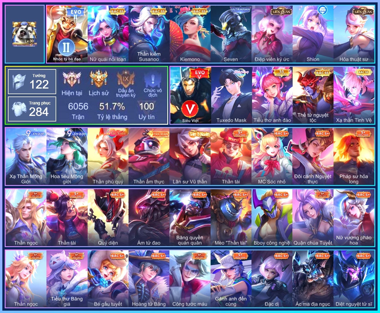 Valhein Hoàng tử Quạ, Valhein Số 7 Thần Sầu, Valhein Hoàng tử Băng, Valhein Thần tài, Valhein Xạ Thần, Valhein S-Quang Vinh, Triệu Vân Quý Công Tử, Triệu Vân Thần Tài, Krixi Cô Tiên Thỏ, Krixi Thuỷ Thủ, Gildur phượt thủ, Gildur Đại gia học viện, Mina Tiểu thư đoạt hồn, Mina Chị đại lắm chiêu, Mina Đào tạo siêu sao, Toro Trung Phong Cắm, Toro Bạch mao Ngưu, Veera Nàng dơi tuyết, Veera Thiên nga đen, Veera Phù thủy Hội họa, Capheny Hầu gái, Capheny S-Quang Vinh, Darcy Nam tước, Darcy Pháp sư hỏa long, Veres Đạo tặc, Veres Chị đại học đường, Elandorr Phi vụ thế kỷ, Elandorr Học viện Carano, Elandorr-Tuxedo, Natalya Nghệ nhân lân, Natalya Quý Cô Thủy Tề, Natalya Thần Phú Quý, Lindis Thám Tử Tư, Lindis Nữ vương pháo hoa, Lindis Đồng phục Shihakusho, Sephera Quý tiểu thư, Sephera Phi vụ thế kỷ, Sephera Thủy Liên Hoa, Enzo Phẩm chất quý tộc, Enzo Chiến binh trăng khuyết, Enzo Thần thoại Hy Lạp, Enzo Nhà Leo núi, Sinestrea Giấc mơ trưa, Sinestrea Tiểu thư băng giá, Sinestrea Lữ khách sa mạc, Sinestrea S-Quang vinh, Max Hiệp Sĩ Nhí, Max Găng Tay Vàng, Max Quang Vinh, Max Chuyên gia đập hộp, Zuka Đại Phú Ông, Zuka Giáo Sư Sừng Sỏ, Zuka Phát Tài, Zuka Gấu Nhồi Bông, Zuka Đầu bếp hoàng cung, Zuka Rapper Big Panda, TeeMee Xiếc Cung Đình, Teemee Tay đua siêu tốc, Teemee Thịt xiên nướng, Zill Lốc Địa Ngục, Zill Dung nham, Zill Diệt nguyệt tử sĩ, Zill Thần mộng mị, Rouie Sứ giả vũ trụ, Rouie Quang Vinh, Alice Nhà chiêm tinh, Alice Bé Gấu Tuyết, Alice Xứ sở thần tiên, Alice Dạ hội, Alice The Butterfly Mansion Girl, Paine khúc nhạc tử vong, Paine Công tước máu, Lorion Chiến giáp hắc ám, Nakroth BBoy công nghệ, Nakroth Quán quân, Nakroth Producer Tia chớp, Nakroth Siêu Việt 1, Nakroth Siêu Việt 2, Nakroth Siêu Việt 3, Nakroth Siêu Việt 4, Skud Sơn Tặc, Laville Tay đua đường phố, Laville Tay súng vô địch, Laville Xạ Thần Tinh Vệ, Laville Thám tử học đường, Fennik Nhà thám hiểm, Fennik Đội đặc nhiệm, Fennik Tiệc Bánh Kẹo, Fennik Tay đua F1, Fennik Shipper Siêu thanh, Violet Nữ đặc cảnh, Violet Phi Công Trẻ, Violet Phó học tập, Violet Đặc Dị, Violet Huy Chương Vàng, Florentino Vũ kiếm sư, Florentino Kiếm sĩ Olympic, Florentino Thần thoại Hy Lạp, Florentino SEVEN, Florentino Hisoka, Florentino S-Quang Vinh, TelAnnas Cảnh Vệ Rừng, TelAnnas Giám thị thân thiện, Telannas Dạ hội, TelAnnas Quang Vinh, Kahlii Siêu đầu bếp, Kahlii Tử điệp, Zephys Oán linh, Zephys Phi thương, Zephys Tư lệnh viễn chinh, Zephys Đầu bếp Sashimi, Lữ Bố Nam Vương, Lữ Bố Thần Ngọc, Lữ Bố Vũ điệu Samba, Ryoma Thợ Săn Tiền Thưởng, Ryoma Đại Tướng Nguyệt Tộc, Ryoma Dạ hội, Ryoma Ailing Samurai, Preyta Băng Hỏa Long Sư, Preyta Phi cơ F1, Yorn Thế Tử Nguyệt Tộc, Yorn Đặc Nhiệm Swat, Yorn Soái ca bãi biển, Taara Hỏa Ngọc Nữ Đế, Taara Shion, Allain Lân sư Vũ thần, Wisp Hải Tặc Nhí, Wisp Ếch nhồi bông, Murad Thợ Săn Tiền Thưởng, Murad M-TP Thần Tượng Học Đường, Murad Thiên Tài Sân Cỏ, Murad S-Quang Vinh, Liliana Hồ Quý Phi, Liliana Tiểu thơ anh đào, Liliana Thuỷ thủ hồ ly, Mganga Doombot Hủy Diệt, Rourke Cuồng tặc, Ybneth Hạt trưởng kiểm lâm, Ybneth Động cơ vĩnh cửu, Arduin, Arduin Tà linh hiệp sỹ, Quillen Sao đỏ học đường, Quillen Người gác đền, Thane Kẻ Hủy Diệt, Thane Mật vụ, Annette Nữ quản ga, Stuart Gã hề, Omega Người máy xanh, Omega Cỗ Máy Siêu Tốc, Omega Hộ vệ ba bích, Omega Hộ Vệ Carano, Yena Khuyên Bạc, Yena Hoạt náo viên, Yena Nữ hoàng thể thao, Yena Nữ cướp biển, Yena Hoa tiêu Mộng giới, Xeniel Thiên Sứ Hủy Diệt, Xeniel Kim sí điểu, Xeniel Thần thoại Hy Lạp, Butterfly Teen Nữ Công Nghệ, Butterfly Nữ Quái Nổi Loạn, Butterfly Gánh anh đến cùng, Astrid Bạch Kiếm Tiểu Thư, Maloch Ác Ma Địa Ngục, Maloch Ác nhân vô tuyến, Maloch Đại ca Mukbang, Raz Đại tù trưởng, Raz Băng Quyền Quán Quân, Raz Saitama Cosplay, Volkath Xung thiên thần tướng, Volkath Tư lệnh viễn chinh, Volkath Quang vinh, Arum Linh tượng vu nữ, Arum Nữ hoàng gấu xám, Arthur Hoàng kim cốt, Arthur Lãnh chúa xương, Arthur Si Tình Kiếm, Zata Tư lệnh viễn chinh, Azzenka Quang Vinh 2.0, AzzenKa Giáng sinh An lành, Azzenka U Hồn Sa Mạc, Aleister Thiếu Niên Hắc Ám, Aleister Quỷ soái nguyệt tộc, Aleister Xứ sở thần tiên, Aleister Tư lệnh viễn chinh, Aleister S - Quang Vinh, Dextra Quận chúa Tuyết, Dextra Quý cô Tuổi Dần, Dextra Lữ khách cao nguyên, Tulen Phù Thủy Kiến Tạo, Tulen Đông êm đềm, Tulen Dạ hội, Thorne Cận vệ hoàng gia, Điêu Thuyền Nữ Vương Anh Đào, Điêu Thuyền Nữ y tá, Điêu Thuyền Mèo công nghệ, Điêu Thuyền Thần Ngọc, Kriknak Bọ Cánh Bạc, Kriknak Yêu trùng cổ mộ, Kriknak Bọ cánh cam, Ilumia Nữ Chúa Tuyết, Ilumia Diva nổi loạn, Ilumia Ngược dòng thời gian, Jinna Đại Tư Tế, Jinna Hỏa nhãn ma vương, Richter Bá tước, Richter Dạ hội, Richter Kiếm thần Susanoo, Richter Quang vinh 2.0, Airi Thích Khách, Airi Kiemono, Airi Đặc công tử điệp, Airi Lễ hội mùa xuân, Cresht Thợ sửa cáp, Slimz Thỏ Thợ Mỏ, Slimz Sứ giả Thiên giới, Slimz Siêu Cấp Tối Thượng, Grakk Mèo thần tài, Grakk Màu cờ sắc áo, Grakk Thần ẩm thực, Ngộ Không Đạo tặc, Ngộ Không Nhóc tỳ bá đạo, Ngộ Không Cổ thầ